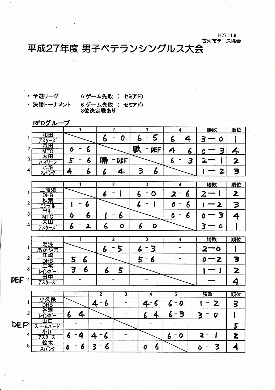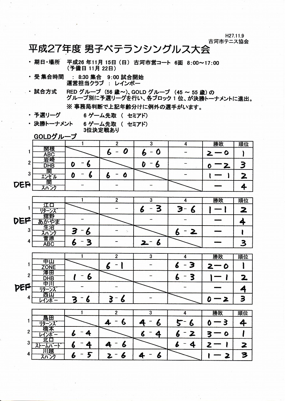 H27年ベテランシングルス大会 結果(11/15)