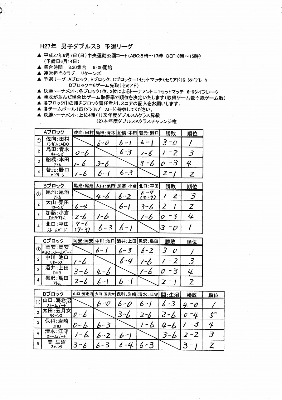 H27年度男子ダブルス選手権大会Bクラス結果