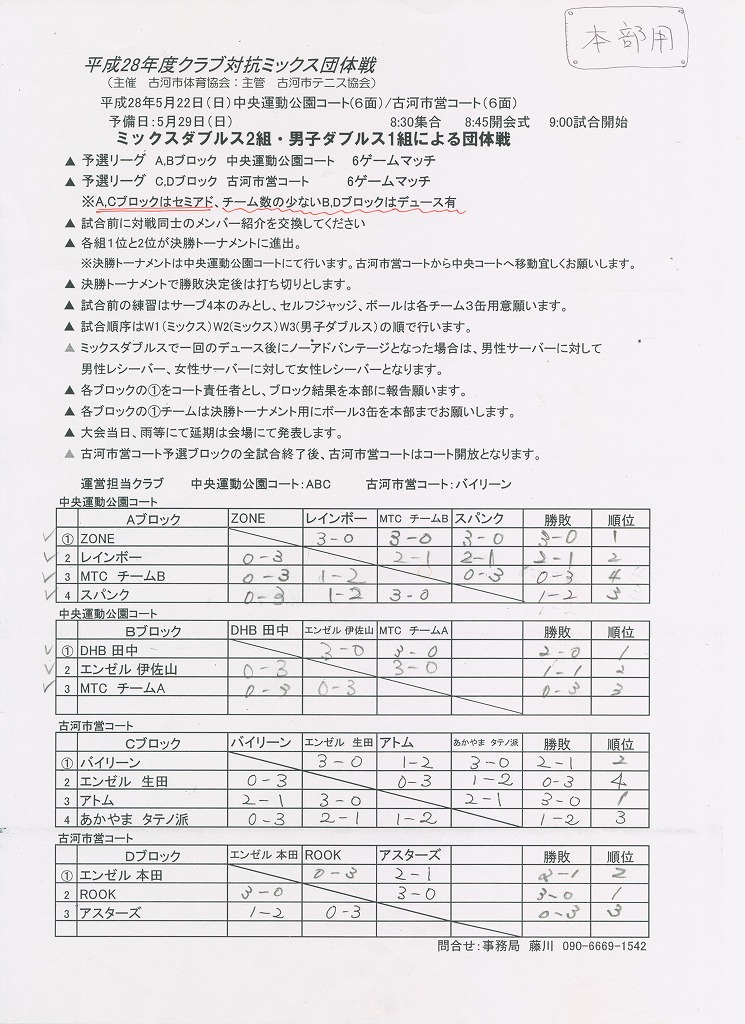 H28年度クラブ対抗ミックス団体戦 ドロー